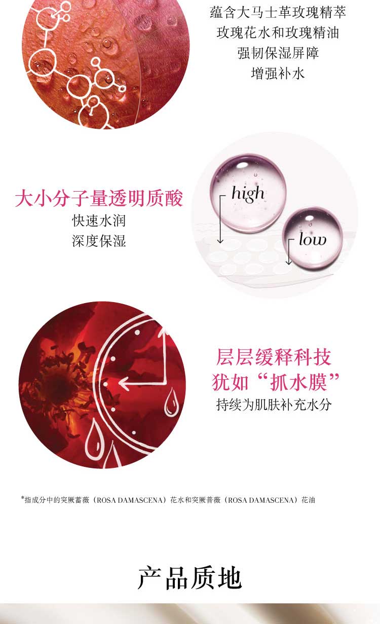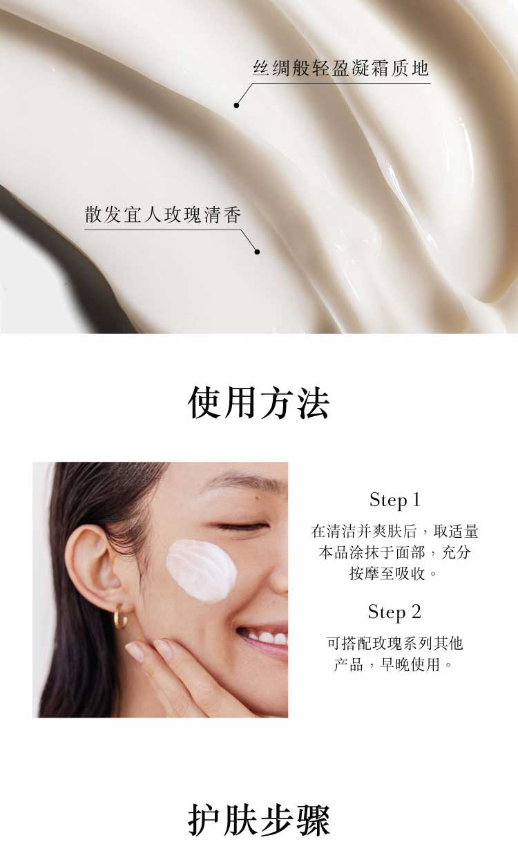 这款轻盈的面霜注入了舒缓的玫瑰花水和玫瑰花油,能为肌肤集中水润保湿。运用保湿科技的创新“ 抓水膜” ,为肌肤补充水分,持续锁水,具有出色的保湿功效。