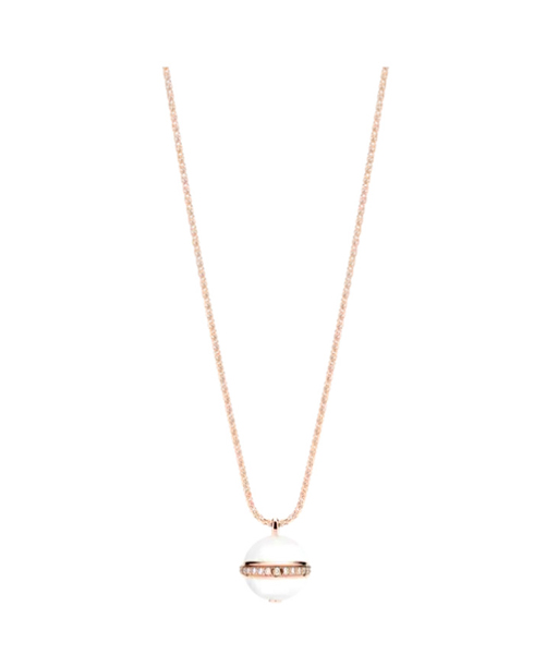 POSSESSION系列玫瑰金长项链,搭配白玉髓吊坠,饰以旋转钻石圆环。这款轻盈的玫瑰金钻石坠饰,呈现纯净的白色,以优雅魅力为您的世界增添光彩,正是迷人的珍贵伴侣。镶钻旋转圆环簇拥两颗凸圆形白玉髓。您可随心佩戴这款高级坠饰:搭配一条长项链或两条短项链。
